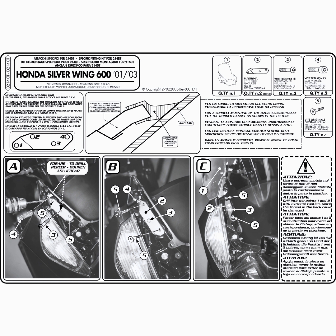 CONTENUTO DEL KIT: INCLUDE TUTTE LE STAFFE, VITI E ACCESSORI NECESSARI PER IL FISSAGGIO DEL PARABREZZA 214DT SULLA HONDA SILVER WING 400, FACILITANDO UN'INSTALLAZIONE PLUG & PLAY SENZA MODIFICHE STRUTTURALI.