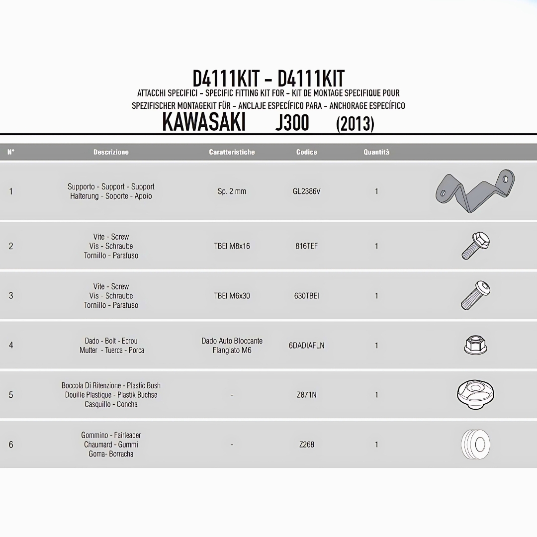 IL KIT KAPPA MOTO D4111KIT È UN SET DI ATTACCHI SPECIFICI PROGETTATO PER IL MONTAGGIO DEL CUPOLINO TRASPARENTE ORIGINALE KAPPA MODELLO D4111DT SULLA MOTO KAWASAKI J300 ANNO 2014. QUESTO KIT È ESSENZIALE PER GARANTIRE UNA CORRETTA E STABILE INSTALLAZIONE DEL CUPOLINO, ASSICURANDO SICUREZZA, BUONA RESA AERODINAMICA E PROTEZIONE DAL VENTO DURANTE LA GUIDA.