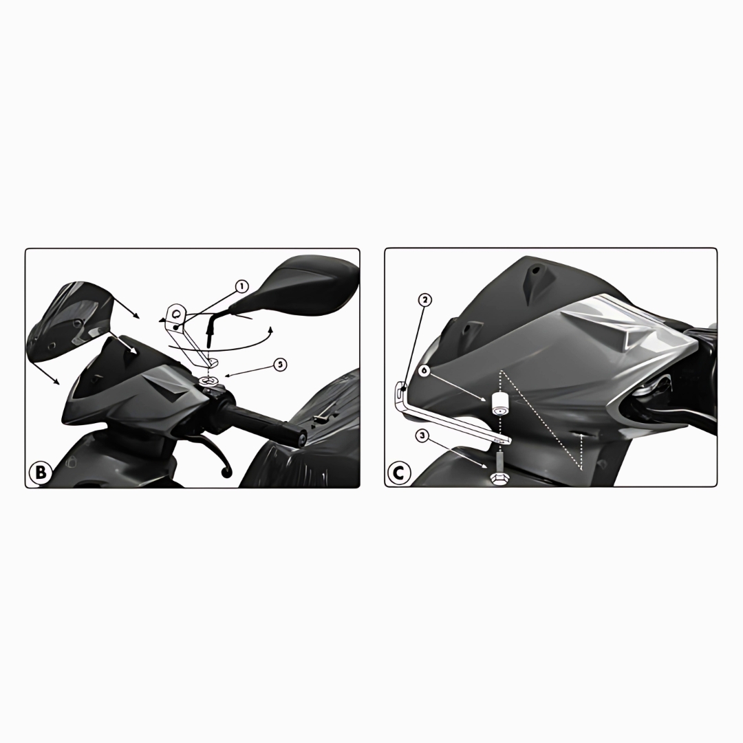 IL KIT FISSAGGIO KAPPA A440AK È PROGETTATO SPECIFICAMENTE PER I VEICOLI KYMCO AGILITY 50, 125 E 150 R16, COMPATIBILI CON I MODELLI PRODOTTI TRA IL 2008 E IL 2013. QUESTO KIT È IDEALE PER L'INSTALLAZIONE DI PARABREZZA DEL TIPO 440AK O 441AK, CHE POSSONO ESSERE ACQUISTATI SEPARATAMENTE.